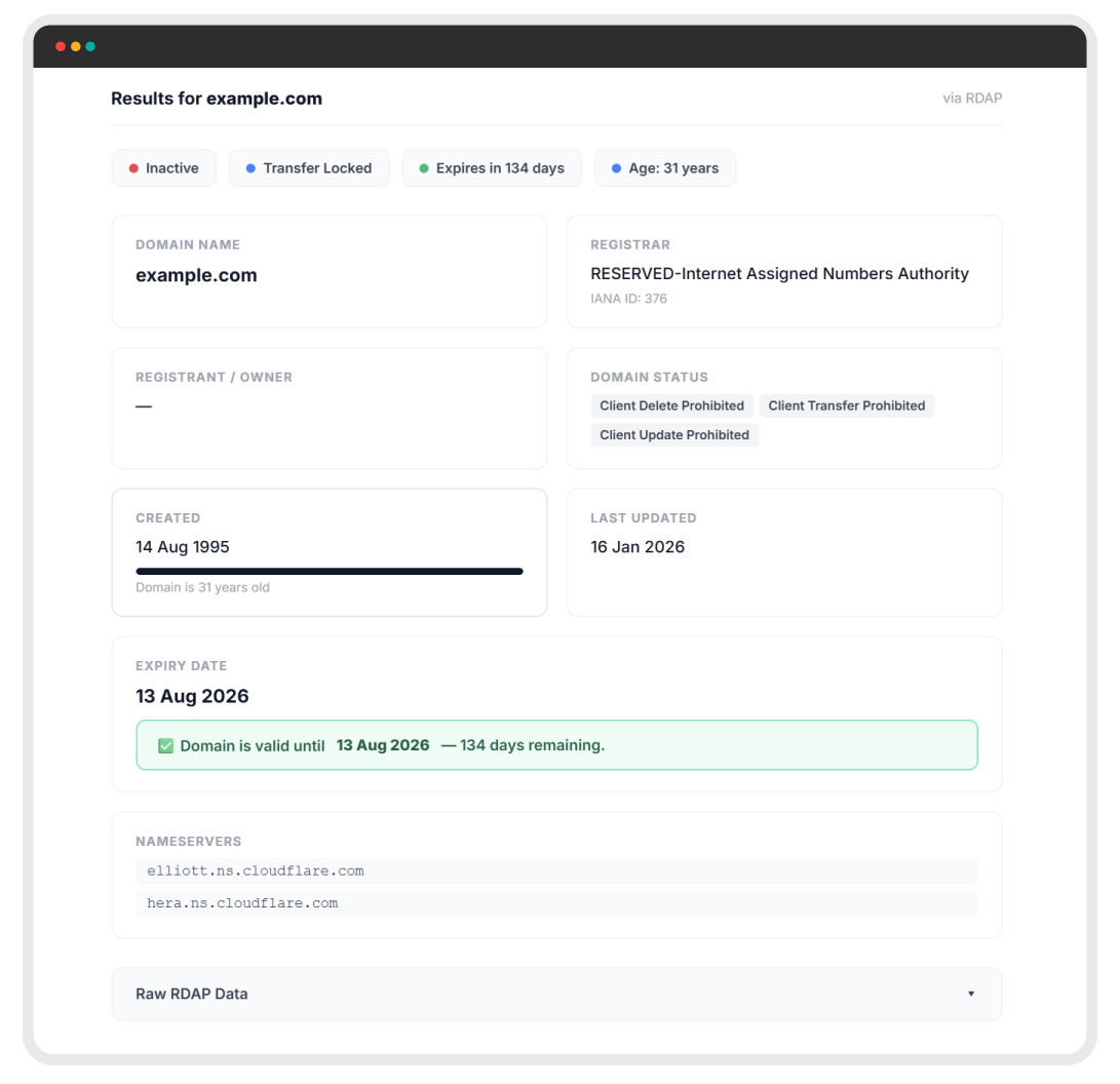 Consulta al instante los datos de registro, titularidad, caducidad y servidores de nombres de cualquier dominio.