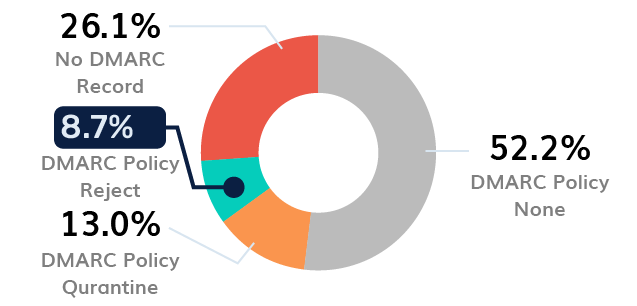 12.2%に及ぶDMARC未対応のギャップにより、攻撃者は配送パートナーに偽装された請求書を送信し、銀行口座情報を変更して運賃の支払いを横取りすることが可能になります。物流企業はジャストインタイムのデータを扱っているため、電子メールの信頼性に少しでも支障が生じれば、サプライチェーンが停止する恐れがあります。
