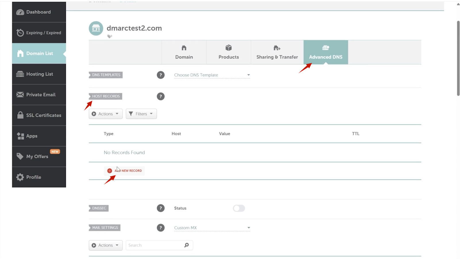 - Head over to the ‘Advanced DNS’ tab and find the ‘Host Records’ section (there, we will add the records).