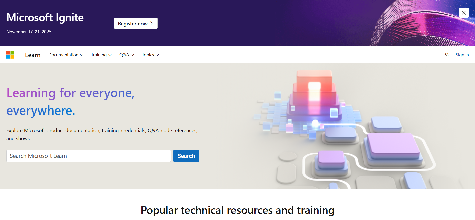 Microsoft Learn is de belangrijkste en meest gezaghebbende bron. Het biedt uitgebreide documentatie, handleidingen voor probleemoplossing en vragen en antwoorden van de community voor vrijwel elk Microsoft-product. Dit betekent dat u via dit platform antwoorden kunt vinden op de meeste van uw vragen en problemen.