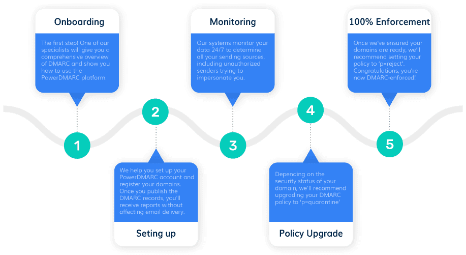 После этого мы поможем вам перейти к политике принудительного применения, которая в конечном итоге поможет вам получить иммунитет против подмены домена и фишинговых атак.